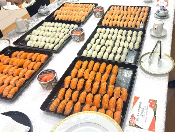 在该招待会上,与会嘉宾以日本酒干杯之后,还品尝了手握寿司、和牛牛排等日本料理。