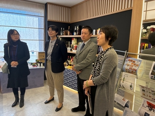 まず、髙田総領事は浜田伸子・在大連領事事務所所長とともに、佐藤秀二・日本貿易振興機構(ジェトロ)大連事務所長を訪問し、同事務所内に設置された日本産食品常設展示ルームを視察するとともに、意見交換を行いました。