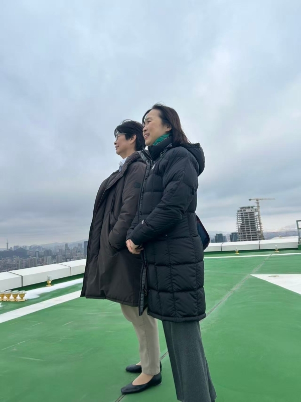 併せ、高田総領事と浜田所長は、山口猛・オリックスビル(大連)有限公司董事長助理の案内のもと、大連交易広場を視察しました。交易広場は2019年3月に再着工、2024年3月に開所した41階建てのオフィスビルで、日中米参加の共同設計・建築で鉄骨鉄筋コンクリート構造等の日本式ビルの特徴を備え、既に日系企業を含む多数の企業が入居しています。高田総領事と浜田所長は202mの高さにある屋上ヘリポートに登り、大連の街を一望しました。